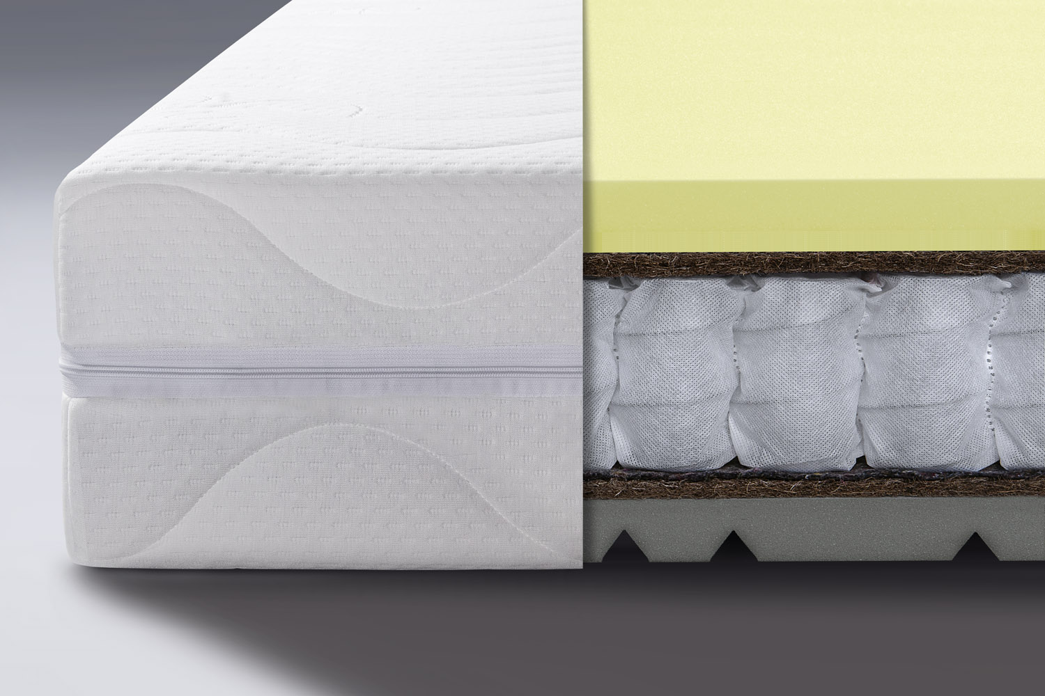 Na oboch stranách matraca sa nachádza vrstva prírodného kokosového vlákna s hustotou 1300 g/m², ktorá výrazne zvyšuje pevnosť, priedušnosť a odolnosť voči deformáciám. Kokos dodáva matracu stabilitu a pomáha odvádzať vlhkosť, čo oceníte najmä v teplejších mesiacoch.