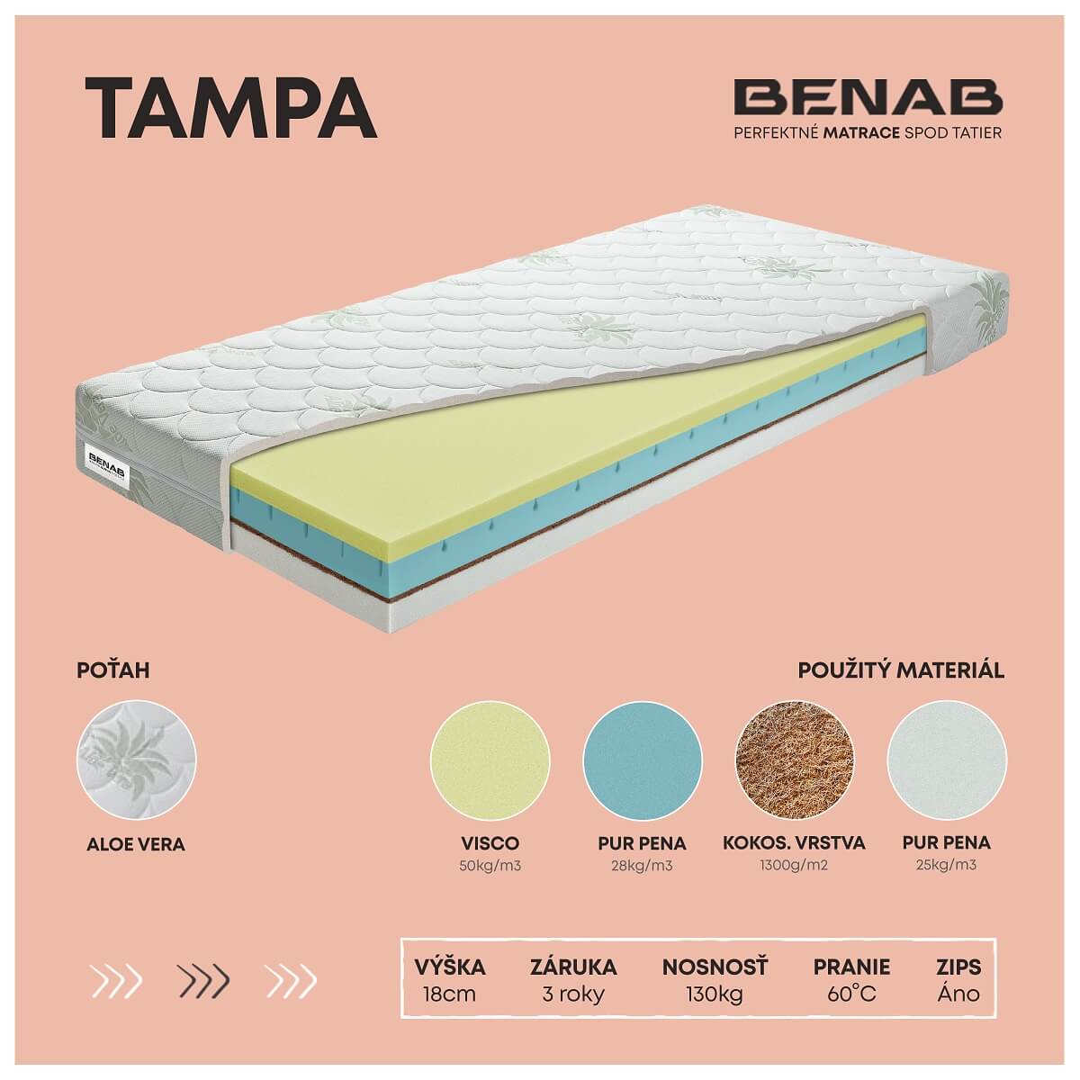 Obľúbený zdravotný matrac z VISCO elastickej pamäťovej peny a prírodného kokosového vlákna. • VISCO pena s pamäťovým efektom reaguje na teplo a tlak, optimálne sa prispôsobí krivkám Vášho tela čím uvoľňuje svalstvo a kĺby • stredové spevnenie a prevzdušnenie jadra pomocou kokosovej vrstvy • odporúčaný rošt lamelový • štandardné vyhotovenie v poťahu - Aloe Vera • VISCO 50 kg/m2, PUR jadro 28 kg/m3, kokosová vrstva 1300 gr/m2, PUR 25kg/m2 Poťah - ALOE VERA • poťahová látka s výťažkami z tejto rastliny obsahuje prevažne enzýmy, minerálne látky a aminokyseliny, ktoré veľmi pozitívne pôsobia na pokožku a posilňujú relaxačné účinky spánku • príjemne mäkký poťah so schopnosťou regenerácie pokožky ľudského tela, vlastnosti tejto látky zaručujú dostatočnú hygienu • certifikovaný a zdravotne nezávadný OEKO-TEX štandard • zloženie: 85 % polyester; 15 % viskóza, obohatený o výťažky z aloe vera, poťah prešitý s klimatizačnou výplňou, PES vláknom 250 gr/m2 •antibakteriálny, antiroztočový, odzipsovateľný a prateľný do 60°C