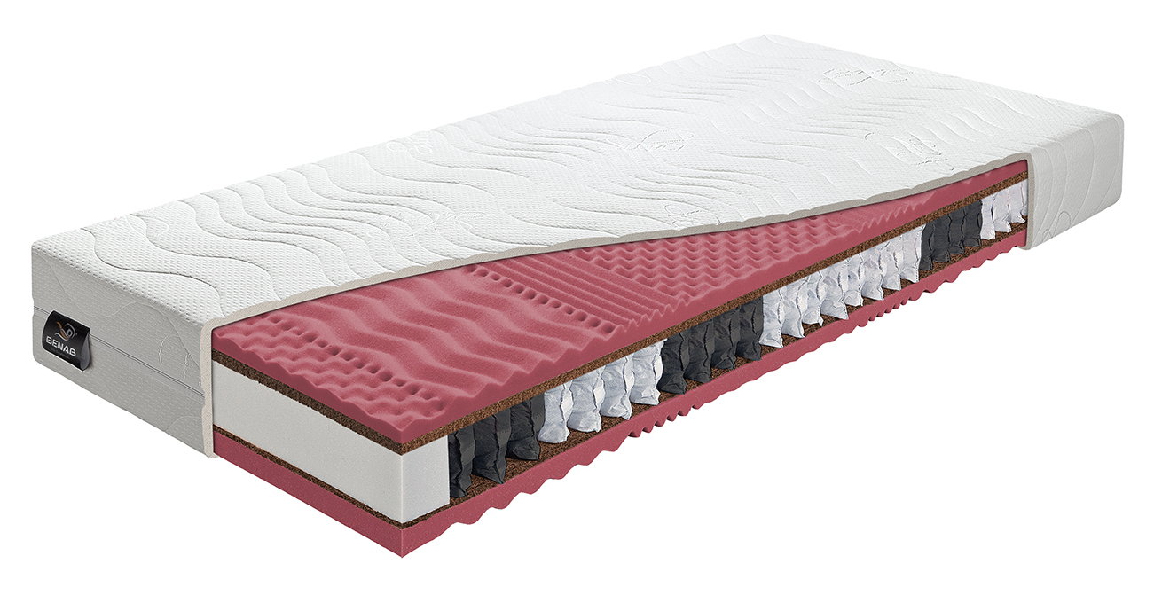 Použitý materiál PUR pena 35kg/m3, kokosová vrstva 1300 gr/m2 1+3cm, taštičková pružina 250 ks/m2 – 7 zon