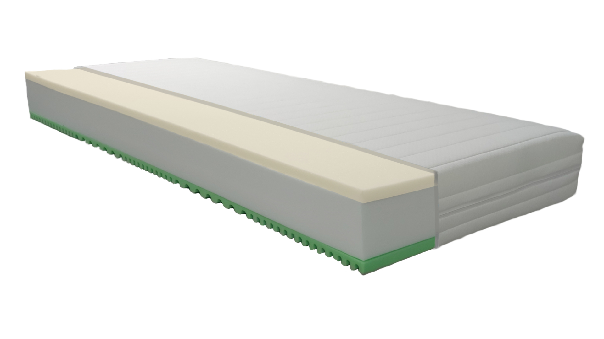 Použité materiály zaručujú optimálnu oporu tela, dlhú životnosť a vysoký komfort – VISCO pena 55 kg/m³, PUR pena so 7-zónovým profilom 35 kg/m³ a PUR jadro 35 kg/m³.