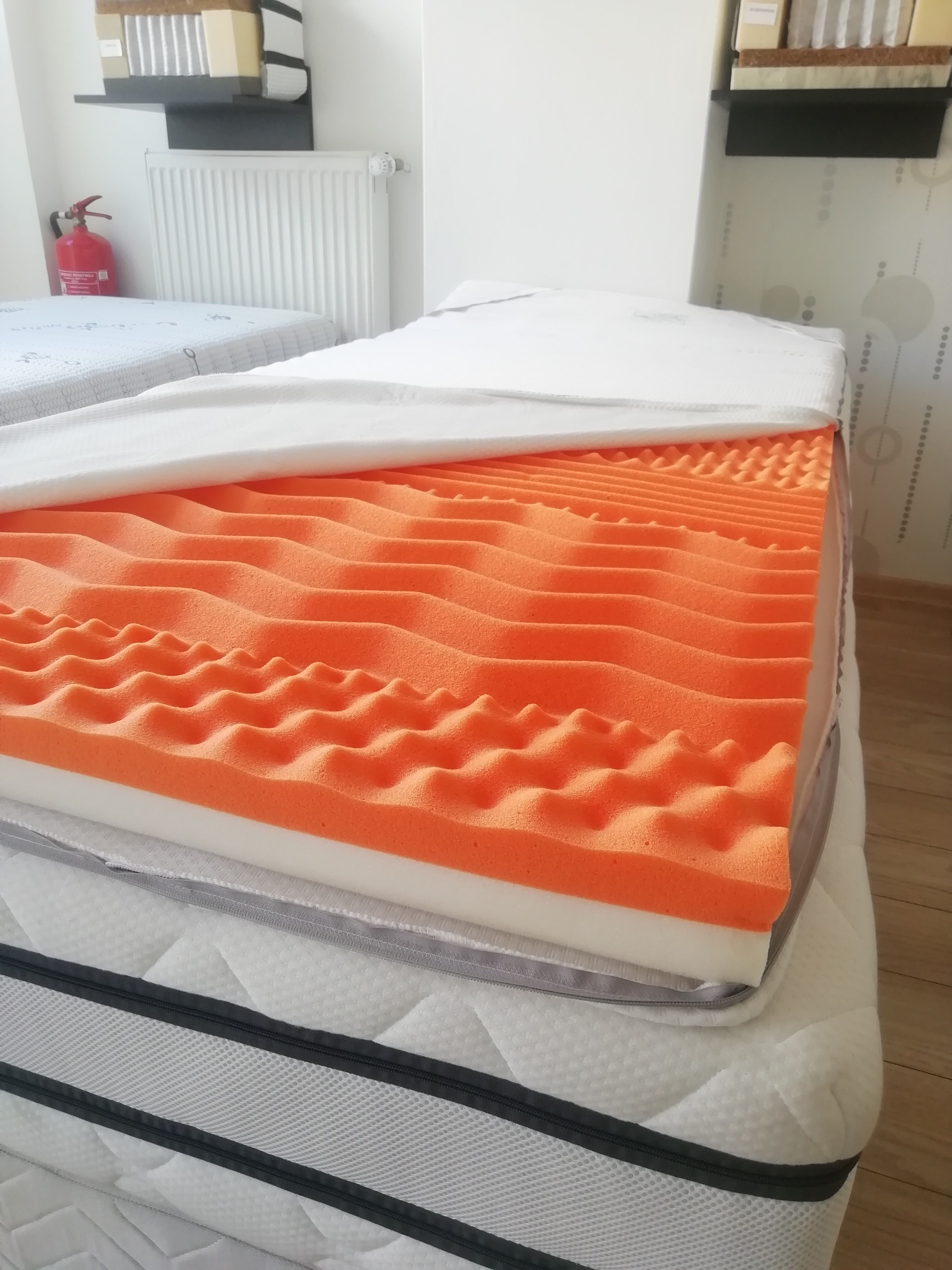 Z jednej strany je 3 cm vrstva 7 zónovej profilovanej pamäťovej VISCO peny, ktorá reaguje na teplo a tlak, dokonale sa prispôsobí vašim krivkám , čo má aj zásadný vplyv na kvalitu spánku, z jednej strany o tvrdosti 2 a z druhej strany je 3cm vrstva kvalitnej HR peny, tvrdosť 4.